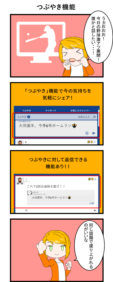 今の気持ちをつぶやいて、気軽にコミュニケーション。つぶやいた内容は、タイムラインに表示されるため、みんなの目にとまりやすいです。つぶやきへの返信や、リアクションボタンで気軽な交流を楽しみましょう。