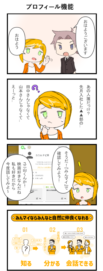 コミュニケーションツール「みんマイ」は、相手のことを「知る→分かる→会話できる」をサポートし、自然に会話が生まれる仕組みが満載のツールです。みんマイを使うことで、コミュニケーションが活性化され、社員の主体性を育て、新しいアイデアの発見や事業の成長につながる「良い組織づくり」に貢献します。